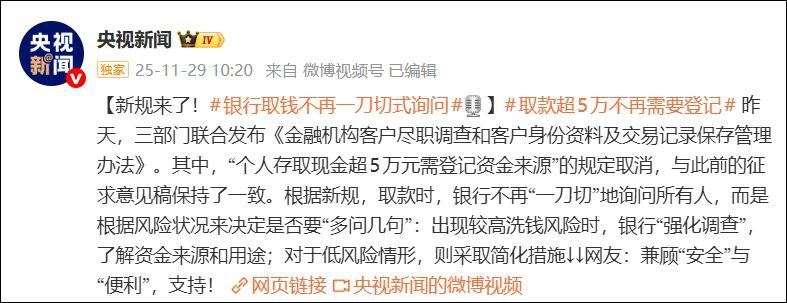 #行业新闻:11 月 28 日,中国人民银行、国家金融监督管理总局、中国证监会联合发布《金融机构客户尽职调查和客户身份资料及交易记录保存管理办法》,明确取消 “个人存取现金超 5 万元需登记资金来源” 的规定,与此前征求意见稿保持一致。